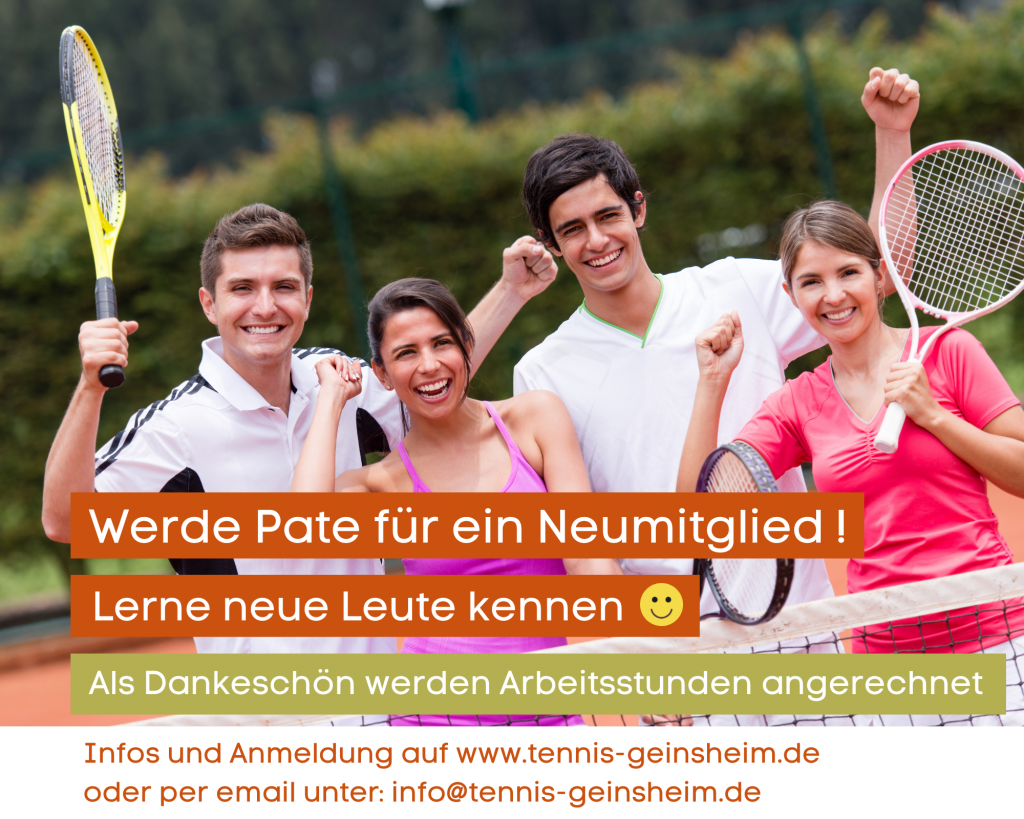 Um neuen Mitgliedern den Einstieg in unsere Tennisabteilung zu erleichtern, haben wir ein Patenschaftsprogramm eingeführt. Wir suchen engagierte Mitglieder, die bereit sind, als Paten für Neumitglieder zur Verfügung zu stehen. Die Paten übernehmen eine wichtige Rolle: Sie erklären das Courtbooking-System, stellen bei Interesse den Kontakt zu unseren Trainern her und spielen in den ersten Wochen ein paar Mal gemeinsam mit dem neuen Mitglied. So fällt der Start auf unserer Anlage leichter, und neue Freundschaften können schnell entstehen. Für ihren Einsatz erhalten die Paten 3 Arbeitsstunden gutgeschrieben.
